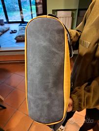 Versatile zainetto, trasformabile in borsa a spalla, in nabuk di colore giallo senape e rifiniture blu. La patta superiore può richiudersi, così che lo zainetto si riduca, o può essere lasciata sollevata per aumentare l'estensione. Lo zainetto presenta due capienti tasche esterne a chiusura con cerniera, di cui una sul retro, un'ulteriore tasca interna laterale, una generoso scomparto interno richiudibile anch'esso con cerniera e due tasche cucite nelle quali inserire, ad esempio, il telefono, o un pacchetto di fazzoletti di carta. Lo zainetto presenta anche un passante, situato nella parte posteriore, attraverso cui lo si può fissare all'asta del trolley. E' stato indossato due sole volte, poiché troppo grande per le mie esigenze. Misura circa 33 centimetri di altezza (quando ripiegato), 42 centimetri quando aperto completamente, 33 centimetri di larghezza. Pari al nuovo, non riporta difetti, come è visibile dalle foto che mostrano il fondo, o gli spallacci: non c'é segno alcuno di usura perché é come nuovo.