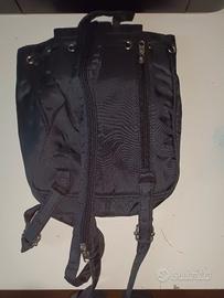 Zainetto piccolo ma capiente, con 3 tasche esterne con zip (una posteriore e due anteriori) , una tasca interna con zip, chiusura con calamita, 23x24x3. Usato e leggermente usurato nella parte interna della chiusura (come da foto). Particolarità: zip che unisce le due bretelle posteriori facendolo diventare, volendo, monospalla.