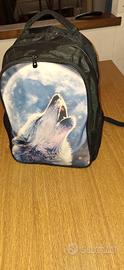 zainetto con immagine lupo, poco usato e in ottimo stato, con due aperture frontali con cerniera altezza 38cm, larghezza 27cm e profondità 9cm circa