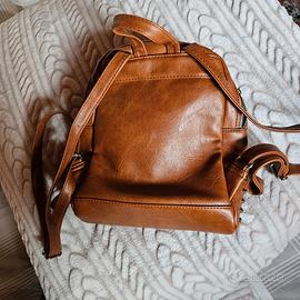 Vendesi bellissimo zainetto in finta pelle (ecopelle) color cuoio borchie argentate sulla tasca frontale. Lo zaino è molto pratico, leggero e ben organizzato, ideale per l’uso quotidiano, l'università o il tempo libero. Dotato di una tasca principale molto capiente e una pratica tasca frontale con zip per gli oggetti più piccoli. Foderato in tessuto chiaro con taschine interne.Spallacci regolabili e manico superiore per il trasporto a mano. Interni puliti e cerniere perfettamente funzionanti. Base: 23 x 13 cm. Altezza: 27 cm.