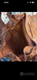 Vendo zainetto originale marca Prima Classe in più che buone condizioni. I due difetti presenti sullo zaino e sono evidenziati nell’ultima foto e si trovano in corrispondenza degli spallacci: le cuciture si sono allentate ma questo non compromette in nessun modo l’uso dello stesso. Lo zainetto misura circa 30 cm di altezza esclusa la maniglia. Dispone internamente di una taschina con cerniera e di due tasche esterne.