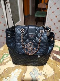 Zainetto Guess di colore nero in ecopelle con chiusura esterna a bottone calamita. Spalline regolabili e chiusura interna con cordino.