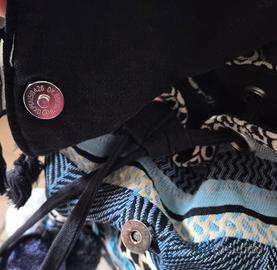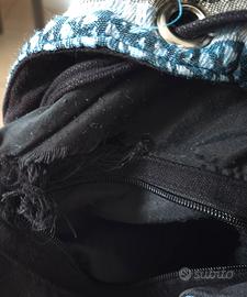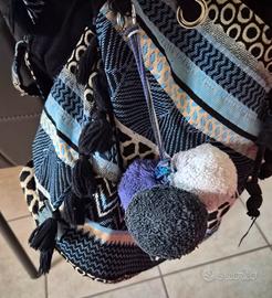 Zainetto di Carpisa collezione primavera-estate. Motivo geometrico etnico e nappe. Ha 3 pompom rimovibili. Chiusura con laccio e bottone a clip. All'interno ha un taschino chiuso con cerniera e un taschino aperto. Colori: nero, azzurro e bianco-giallino. Dimensioni: Altezza circa 35 cm, larghezza massima circa 32 cm. Ottime condizioni eccetto una parte della fodera interna scucita come in foto. Si trova a Ravenna ma è possibile spedizione.