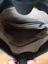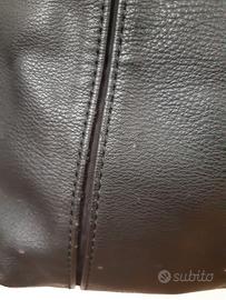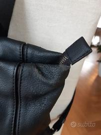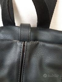 Zainetto nero in ecopelle e tessuto. Usato ma in condizioni ancora molto buone. Difetti visibili in foto. Ha due tasche interne, di cui una chiusa con cerniera e una esterna posteriore.