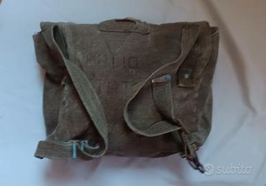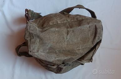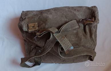 ZAINETTO TIPO MILITARE (SAC A POCHE) VINTAGE (PERIODO ANNI 60/70) GENERALMENTE UTILIZZATO DA COMBATTENTI, DELL’ESERCITO PER VIA DELLA INDOSSABILITÀ AGEVOLATA DOVUTA ALLE DIMENSIONI RIDOTTE, CON CINGHIE PER TRACOLLA REGOLABILI E TESSUTO MOLTO RESISTENTE. SUCCESSIVAMENTE UTILIZZATO PER ALTRI SCOPI CON SCRITTE RIPORTATE LATO APERTURA. MODELLO E CONDIZIONI COME IN FOTO