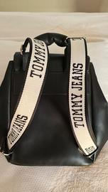 Zainetto nero in ecopelle linea Tommy jeans di Tommy Hifigher. Spallacci in tessuto con logo regolabili molto comodi e zaino capiente, molto leggero ma spesso come imbottitura. Chiusura con bottone e patta tasca interna misure 24hX29 fondo 24X14 manico imbottito. Usato solo una volta