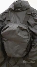 2 zaini trasformabili in giacche idro-repellenti tipo K-Way. Unisex, neri, taglia S e XL, mai usati. Gli zaini sono provvisti di tasca esterna porta oggetti con zip frontale e chiusura superiore, sempre con zip. Una volta trasformati in giacche, gli impermeabili sono provvisti di apertura centrale full-zip, due tasche esterne, due tasche interne, cordino al collo per regolare la chiusura del cappuccio. Quando utilizzato come giacca lo zaino resta fissato alla schiena con la disponibilità della tasca portaoggetti. Gli spallacci dello zaino sono regolabili. Vendibili singolarmente. Il prezzo si riferisce al singolo oggetto.