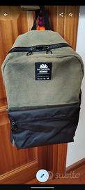 Zaino in robusto cotone trattato anti strappo, in perfette condizioni, con spallacci regolabili, un'ampia tasca esterna con cerniera rivestita in materiale impermeabile, colore verde militare, marca originale SUNDEK.