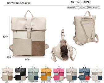 Bellissimo zaino a borsa Nazareno Gabrielli dallo stile moderno e un po' artigianale, realizzato in materiale effetto pelle con una finitura leggermente lucida e morbida. Lo zaino alla tasca posteriore con la zip antifurto. La caratteristica più evidente è il design a blocchi di colore: • la parte superiore e i lati sono in un blu intenso, • al centro c'è una fascia color crema, • nella parte inferiore spiccano due pannelli, uno blu scuro e uno rosso acceso, che creano un contrasto vivace. Lo zaino ha una chiusura con patta ripiegata e cinturino centrale regolabile con fibbia metallica, che gli dà un aspetto un po' vintage. Sopra si vede una maniglia corta per portarlo a mano come borsa, oppure a zainetto con delle spalline. È uno zaino casual ma curato nei dettagli, perfetto sia per l'uso quotidiano che per dare un tocco di colore a un outfit semplice. Disponibile in diversi colori,