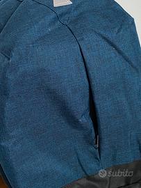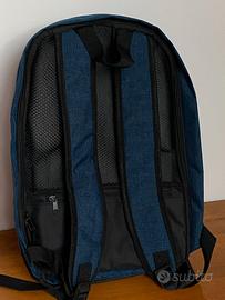 Vendo come da foto zaino blu e nero con sistema di chiusura antifurto per cui la cerniera di apertura è nascosta sul retro dello zaino, ha schienale imbottito antisudore, spallacci regolabili, internamente 2 taschine più una con cerniera e scomparto per computer, esternamente uno scomparto ulteriore con cerniera nascosta nella piega.