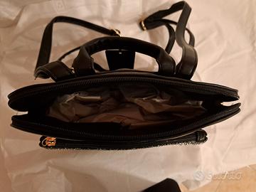 Zaino elegante in pelle Nero con paillettes color argento Doppia tasca e tasca interna Nuovo con cartellino e confezione originale