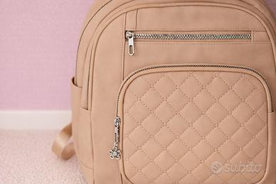 Elegante zaino beige in ecopelle, perfetto per ogni occasione. Il design trapuntato sul taschino frontale dona un tocco raffinato, mentre il charm a forma di fiore aggiunge un dettaglio originale e femminile. • Condizioni: Ottime, usato pochissimo • Dettagli: • Tasca frontale trapuntata con zip e charm floreale • Ampio scomparto principale con zip • Spallacci regolabili in tessuto Ha 4 tasche frontali con zip, una dietro e una all’interno della tasca più grande