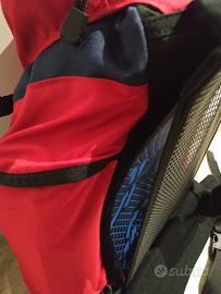 Zaino tecnico Berghaus originale modello Freeflow ventilated back system, leggero e resistente con tessuto in nylon anti-abrasione colore blu e rosso. Capacità 35 litri. Pannello posteriore ventilato e cinghia preformata per sostegno in vita. Ampie tasche laterali, coperchio con tasca chiusa con zip. Lo zaino è dotato di due fascette in nylon per il trasporto di attrezzatura. Misure esterne (A x L x P): 50cm x 45cm x 14cm.