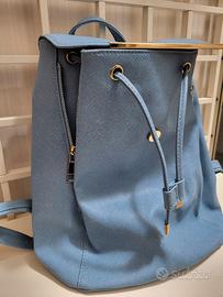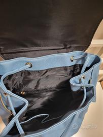 Zaino blu chiaro con dettagli color oro, nuovo mai usato con cinghie regolabili. Resistente e impermeabile. Cerniera interna e zip laterali per espansione.