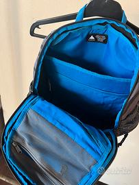 Zaino da 27 litri con tasca superiore porta occhiali in microfibra, cinghie porta skate e svariate tasche Internet ed esterne anche per pc portatile