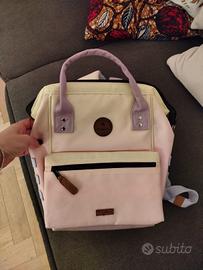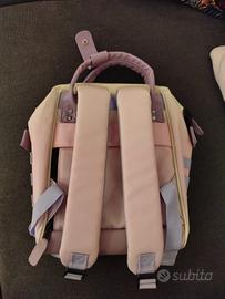 zaino colore giallo e lilla pastello. perfetto per scuola e lavoro. tasche interne ed esterne pratiche. scomparto per computer interno imbottito. tasta esterna rimovibile e sostituibile con altre di diversi colori.