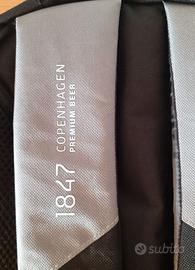Zaino marchiato Carlsberg, con doppio scompartimento e sacche laterali elastiche. Su una bretella è riportata la scritta "1847 Copenhagen Premium Beer", mentre sulla parte centrale in alto è presente il simbolo della corona con la scritta "by appointment to The Royal Danish Court".