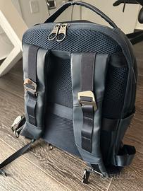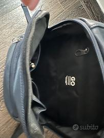 Vendesi zaino in pelle, marca Carpisa Go, dotato di tasca porta pc e tablet, tasca portaoggetti interna e altra tascq esterna + 2 tasche laterali. Colore blu scuro. Piccoli segni di usura nel manico