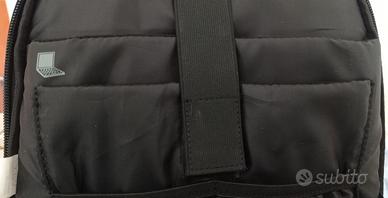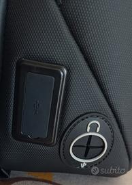 È uno zaino compatto, ma dotato di numerosi scomparti (per laptop, bottiglietta, occhiali), tasca antifurto e inserti riflettenti.