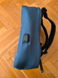 Zaino r-pet marchiato Metro con cavo USB. Ha una tasca esterna e due interne. Colore blu. Misure: 40x28x12 cm. È stato usato poco, ancora in perfette condizioni
