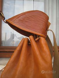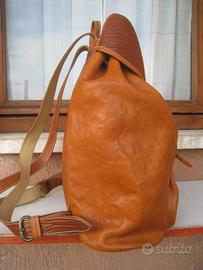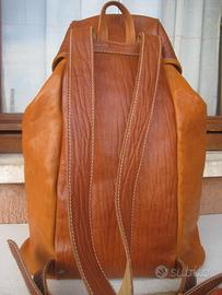zaino artigianale fatto a mano in cuoio naturale robusto, una tasca con cerniera sul davanti, h. cm. 40, largh. cm. 32, prof. cm. 20, lungh.bretelle cm. 66. Peso kg. 0,60.