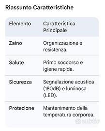 Ecco una descrizione dettagliata delle caratteristiche principali e del contenuto del kit: 1. Zaino Multitasche È l'elemento centrale del kit. Viene descritto come: Ampio e robusto: Progettato per resistere a condizioni difficili. Scomparti organizzati: Dispone di diverse tasche esterne (almeno tre frontali visibili) per suddividere il materiale e renderlo facilmente accessibile. Design: Colore blu scuro con spallacci imbottiti e cinghie di compressione laterali. 2. Accessori Inclusi nel Kit Il kit comprende cinque accessori fondamentali per la sicurezza e l'igiene: Kit di Primo Soccorso: Una pochette rossa contenente forniture essenziali come bende, cerotti e antisettico per trattare piccole ferite o escoriazioni. Lampada LED COB Multifunzione: Una piccola torcia ricaricabile o a batteria con tecnologia COB (Chip on Board) che offre una luce molto intensa. È dotata di un moschettone per appenderla e diverse modalità di luce (bianca, rossa fissa e rossa/blu lampeggiante per segnalazione). Coperta Termica d'Emergenza: Una coperta in materiale metallizzato (tipo Mylar) che trattiene il calore corporeo. È reversibile, compatta e leggera. Fischietto ad Alta Potenza (180dB): Un fischietto compatto progettato per emettere un segnale acustico molto forte, udibile a lunga distanza, fondamentale per le chiamate di soccorso. Tovaglioli Compressi: Confezioni di "pastiglie" di tessuto compresso. Quando vengono a contatto con l'acqua, si espandono diventando salviette igieniche per la pulizia personale.