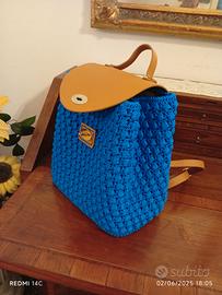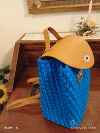 Realizzato a mano a uncinetto Patella, fondo e bretelle in vera pelle Filato made in Italy di ottima qualità Dimensioni base 28 x 18 cm Altezza cm 27