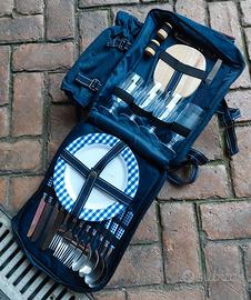 Vendo zaino da Pic nik, mai usato. Composto da piatti, forchette, bicchieri, contenitori sake, olio, pepe, apribottiglie etc. Inoltre oltre a vari scomparti ci sono borsa laterale x bottiglia e cinghie porta telo da usare come tovaglia oppure stuoia