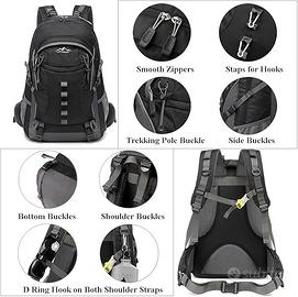 - Zaino da Trekking con Tante Fibbie: Fibbia superiore; Cordino per palo da trekking; Fibbia per sacco a pelo; Fibbia per tenda; Fibbia laterale; Fibbia in vita; Fibbia sul petto. Ideale per l'escursionismo e l'arrampicata.