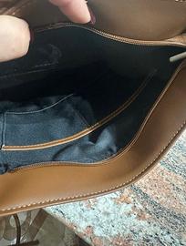 Zaino da Uomo a spalla, completo di tracolla e manico, interamente in pelle, all’interno porta tre tasche di cui una con là zip, all’esterno una tasca con là zip, mai usato misure: Larghezza 28 Altezza 32 Profondità 11