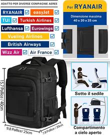 Si adatta perfettamente sotto il sedile e nel vano cappelliera adatto alla maggior parte delle principali compagnie aeree come Ryanair, EasyJet, New Easyjet, British Airways, Qantas, Etihad.