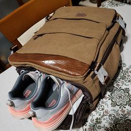 zaino da viaggio da 40 litri con scomparto per scarpe, porta di ricarica USB e tasche multiple. Si può portare sia come borsone con la tracolla che come zaino a spalla.