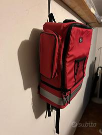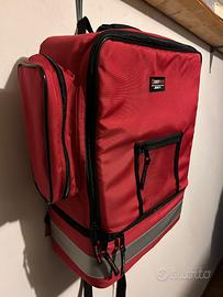 Zaino di primo soccorso realizzato in materiale antistrappo a 2 sezioni. La sezione inferiore è rinforzata con struttura rigida antiurto atta a contenere apparecchi elettromedicali. La sezione superiore è dotata di alloggiamenti modulabili appositamente progettati per contenere i vari strumenti di pronto soccorso.;ed è provvista di elastici e tasche a strappo. Completo di tasche laterali con chiusure a cerniera.