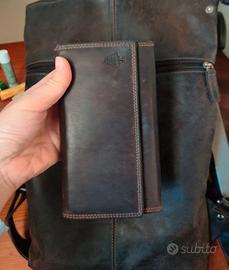Zaino e portafoglio nuovi, usati forse un paio di volte, in pelle marrone testa di moro, originale Green Wood. Adatto sia a donna che a uomo. Molto versatili. Zaino capiente e con molte tasche sia interne che esterne.