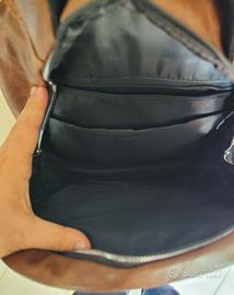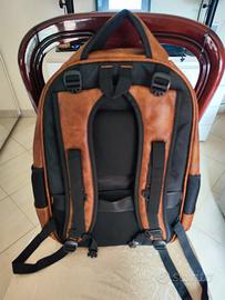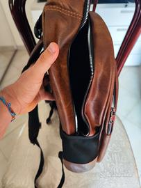 Vendo per inutilizzo questo spazioso zaino in Ecopelle di colore marrone con fibbie regolabili, tre scomparti interni, schienale traspirante, due tasche laterali e un taschino frontale.