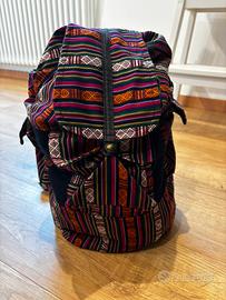 Vendesi zaino in stile etnico/boho, caratterizzato da una vivace trama multicolore tessuta a mano. Ideale per chi cerca un accessorio unico, resistente e funzionale per il tempo libero, i festival o l'uso quotidiano.
