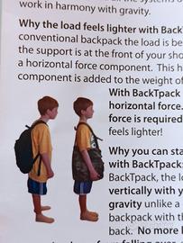 E un' alternativa allo zaino che bilancia i carichi nelle borse laterali anziché sulla schiena. Progettato da una fisioterapista. Soluzione ortopedicamente sana ai problemi degli zaini scolastici. A differenza di uno zaino tradizionale con il carico fuori asse e la distorsione della postura, questo sistema assiale assicura un allineamento posturale ideale per un trasporto del carico sano, sicuro e benefico. Misura small per bambini o adulti di corporatura minuta. Ideale per trasporto a piedi ma anche in bicicletta o trekking. Semplice da lavare. È dotato di molteplici tasche (12) - 2 grandi borse laterali - spallacci regolabili - cinghia regolabile. Tessuto Nylon stropicciato e anti strappo. Tutte le info sul sito BackTPack. Costo 80€