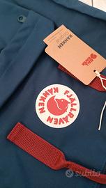 zaino Fjällräven Kanken di colore blu con lacci bordeaux. Nuovo mai utilizzato, regalato da poco Misura grande 20 litri