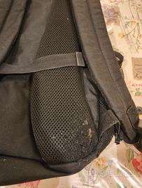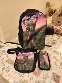 Vendo zaino completo di tracolla e astuccio. Lo zaino è alto 45cm, largo 30cm, profondo 15cm. È dotato di un' unica cerniera anteriore, mentre nella parte superiore è presente un piccolo vano con cerniera dove si può riporre qualche monetina o delle chiavi.Sui fianchi si trovano 2 retine portabottiglie. Lo zaino è stato usato una stagione scolastica. Vendo i 3 pezzi a € 15 non trattabili. Solo consegna a mano dopo visione.