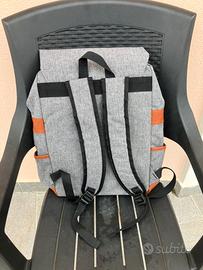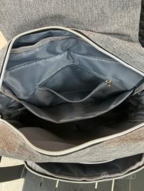 Zaino dal design moderno, perfetto per l'uso quotidiano. - Tessuto grigio mélange. - Dettagli in ecopelle marrone. - Chiusure con fibbie decorative. - Tasche laterali. - Zip frontale. Misure 43x40x15
