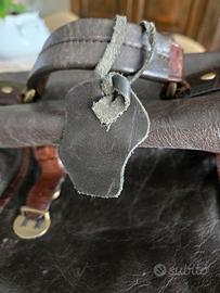 Zaino in autentica pelle (vedi il particolare dell'"attestato" nella foto 5), con una tasca davvero molto capiente al centro, una sul davanti (con cerniera), diverse più piccole all'interno, con due laterali esterne per la bottiglia dell'acqua e per l'ombrello