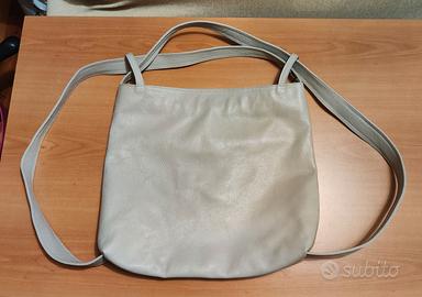 Sacca zaino da donna in VERA PELLE colore grigio ghiaccio . Spazioso (ci sta anche il pc), comoda e pratica, dotata di spallacci in vera pelle, fodera interna, due tasche interne, una tasca esterna con cerniera e scomparto che divide in bue l'interno, sempre chiuso con cerniera. Misure: larghezza: 37 cm altezza: 37 cm profondità: 12+ cm. Molto capiente sia come borsa a spalla che come zaino.