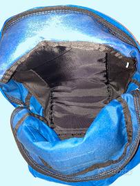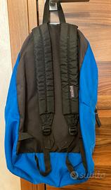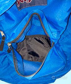 Zaino Jansport grande colore bluette con inserti neri, chiusura con zip, una tasca frontali con chiusura a zip, nessuna tasca interna, dimensioni cm 42X32X14, spallacci imbottiti con taglio dritto, usato, in buono stato