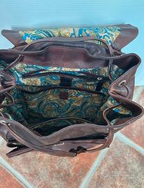 La pelle di vitello è stata conciata impiegando tannini vegetali estratti da cortecce d’albero ed è stata rifinita con una tamponatura manuale che crea un bellissimo effetto di nuance di colori che esaltano il pregio dello zaino. La concia al vegetale, a contatto con l’epidermide umana, ha il grande pregio di non provocare reazioni allergiche. La lavorazione è completamente artigianale ed ogni pezzo è curato nei minimi dettagli.