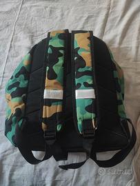 Vendo zaino marca MATE con originale fantasia mimetica (camouflage) e grafica frontale cartoon. Ampio scomparto principale con chiusura a zip e comoda tasca esterna per gli oggetti più piccoli (zip tasca davnti rotta).