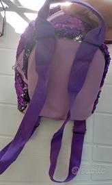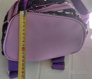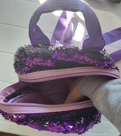 Zaino piccolo da ragazza, molto carino e glitterato! Le paillettes sono reversibili (viola/nero iridescente), effetto cangiante bellissimo. Dettagli: Colore: viola/lilla con paillettes Struttura: similpelle lilla sul retro e sul fondo Bretelle regolabili in nylon viola Maniglia superiore 2 scomparti con zip + tasca frontale Interno foderato in tessuto lilla Dimensioni: circa 22 cm di larghezza × 20 cm di altezza × 10 cm di profondità Condizioni: buone, qualche piccolo segno di utilizzo sul fondo (visibile in foto) Perfetto per bambine/ragazze, per la scuola o il tempo libero 🌟