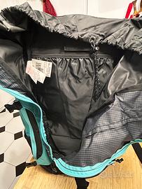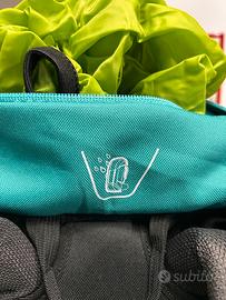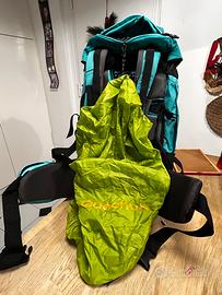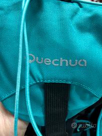 Zaino aquistato e usato una sola volta . Turchese e nero multitasche con rete anti sudore, copertura estraibile anti pioggia, elastici porta oggetti regolabili (Quechua) 55h x 30 larghezza, buona capienza. In ottime condizioni - no difetti o usura (Non accetto resi)