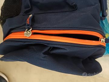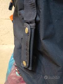 Materiali: È realizzato in un tessuto scuro (blu navy) con accenti arancioni accesi, descritto come un materiale di "notevole robustezza" e molto resistente.