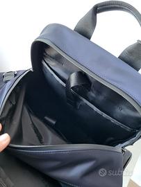 Zaino in Nylon antistrappo blu scuro Emporio Armani. Tasca interna per porta pc lap top imbottita con chiudura cibturino velcro. Tasca interna porta documenti. Due tasche esterne laterali con zip. Chiusura in cima con zip. Spallacci imbottiti per confort sulle spalle indossandolo. Nuovo con cartellino.