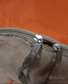 Nelle foto sono evidenziati i tre difetti: una cerniera delle tasche laterali é da sostituire, una piccola scucitura e tasca interna di plastica rovinata.